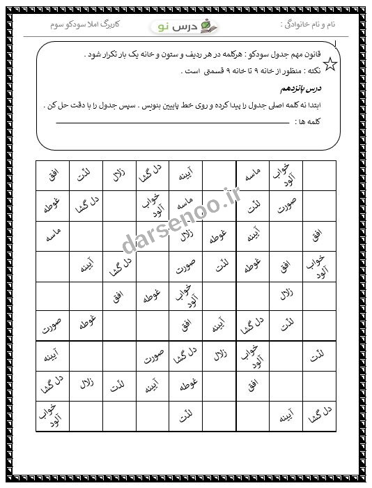 کاربرگ املا سودکو درس 15 فارسی سوم شامل کلمات مهم و سخت از نظر املایی است . این کاربرگ با تلفیق فارسی و بازی ریاضی . ضمن تمرین و تثبیت یادگیری باعث افزایش قدرت حافظه بینایی و توجه و تمرکز می شود .