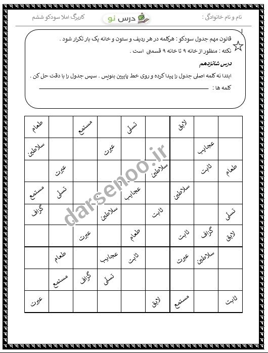 کاربرگ املا سودکو درس 16 فارسی ششم شامل کلمات مهم و سخت از نظر املایی است . این کاربرگ با تلفیق فارسی و بازی ریاضی . ضمن تمرین و تثبیت یادگیری باعث افزایش قدرت حافظه بینایی و توجه و تمرکز می شود .