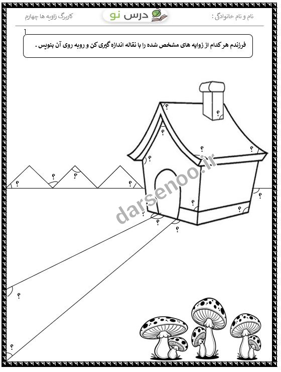 کاربرگ اندازه گیری زاویه ها ،تلفیقی از ریاضی و هنر است . دانش آموز با استفاده از نقاله زاویه های موجود در تصویر را اندازه گیری می کند . در انتها تصویر را طبق سلیقه رنگ آمیزی می کند .