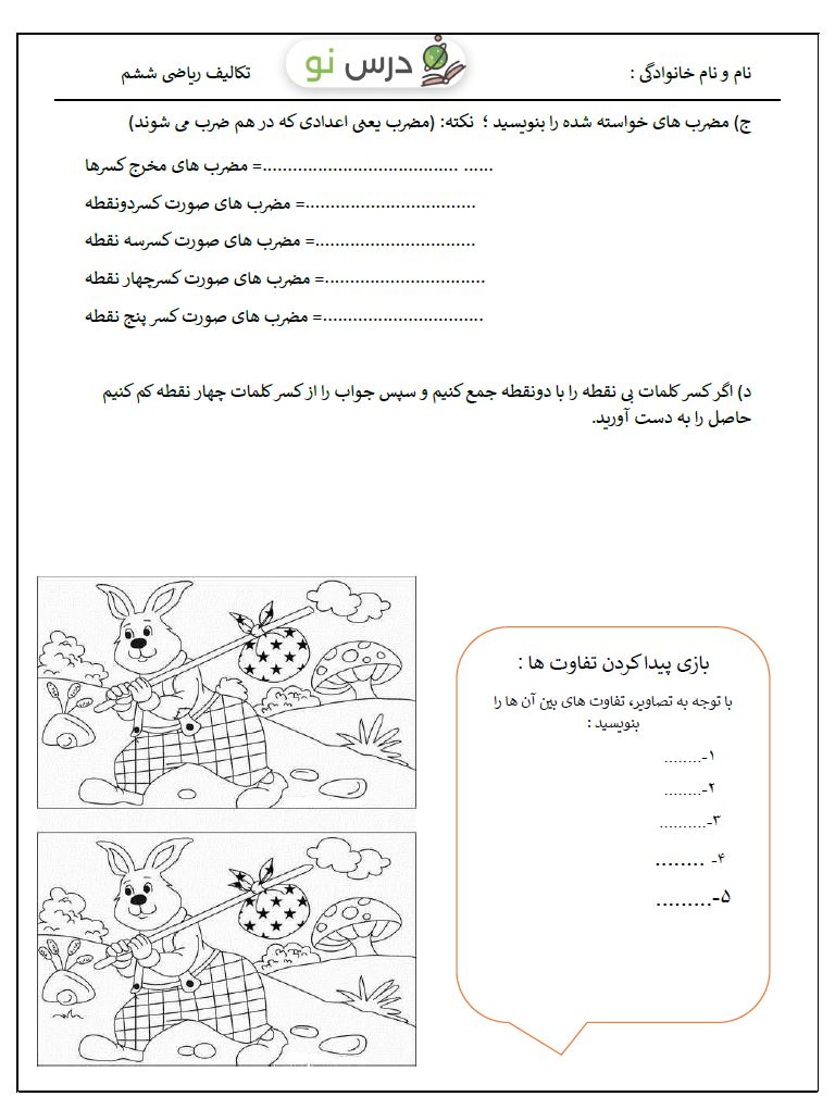 کاربرگ جمع و تفریق کسر ها ویژه دانش آموزان ششم ابتدایی است .