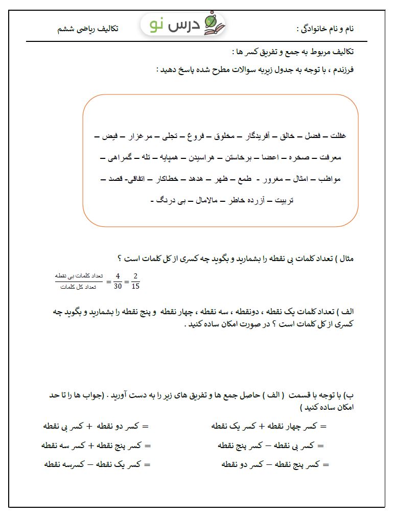 کاربرگ جمع و تفریق کسرها تلفیقی از درس فارسی و ریاضی است . دانش آموز تعداد تعداد نقطات هر کلمه را می شمارند. و طبق دستور العمل آن را بر تعداد کل کلمات موجود در جدول که 30 تا هست و عدد ثابتی هست به صورت کسر در می آورند . سپس به سوالات جواب می دهند . این تکلیف مناسب دانش آموزان متوسط و رو به بالا است .