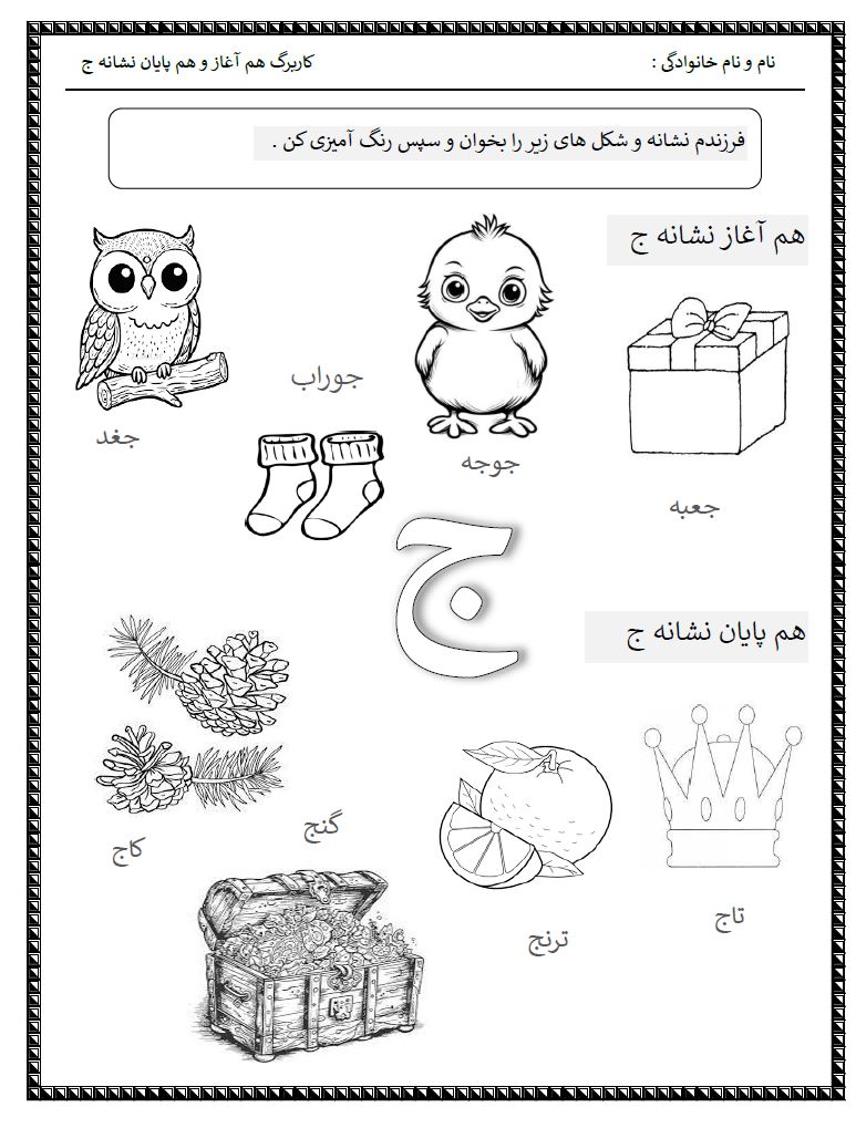 این کاربرگ درباره کلماتی است که با صدای ج شروع می شود و همچنین تعدادی از کلمات که با صدای ج تمام می شود یعنی صدای هم آغاز و هم پایان ج . در این کاربرگ دانش آموزان تصاویر مربوط به نشانه هارا رنگ آمیزی می کنند …