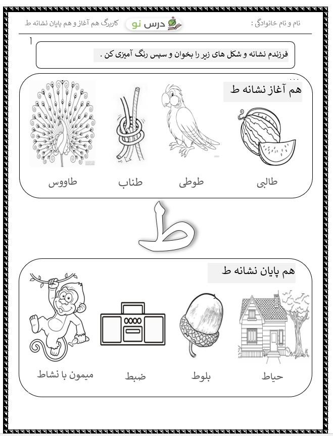 این کاربرگ درباره کلماتی است که با صدای ط شروع  می شود . همچنین تعدادی از کلمات که با صدای ط تمام می شود یعنی صدای هم آغاز و هم پایان ط . در این کاربرگ دانش آموزان تصاویر مربوط به نشانه هارا رنگ آمیزی می کنند .