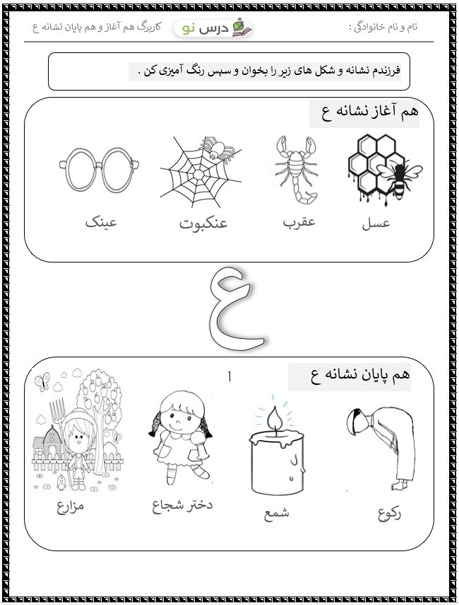 این کاربرگ درباره کلماتی است که با صدای ع شروع می شود . همچنین تعدادی از کلمات که با صدای ع تمام می شود یعنی صدای هم آغاز و هم پایان ع . در این کاربرگ دانش آموزان تصاویر مربوط به نشانه هارا رنگ آمیزی می کنند .